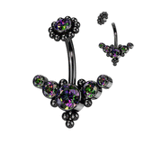 - The belly bar is dressed with a 7mm internally threaded flower pendant ball, black titanium plated.