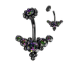 This belly ring is comprised of premium 316L surgical steel and black titanium plated with cubic zirconia gemstones.