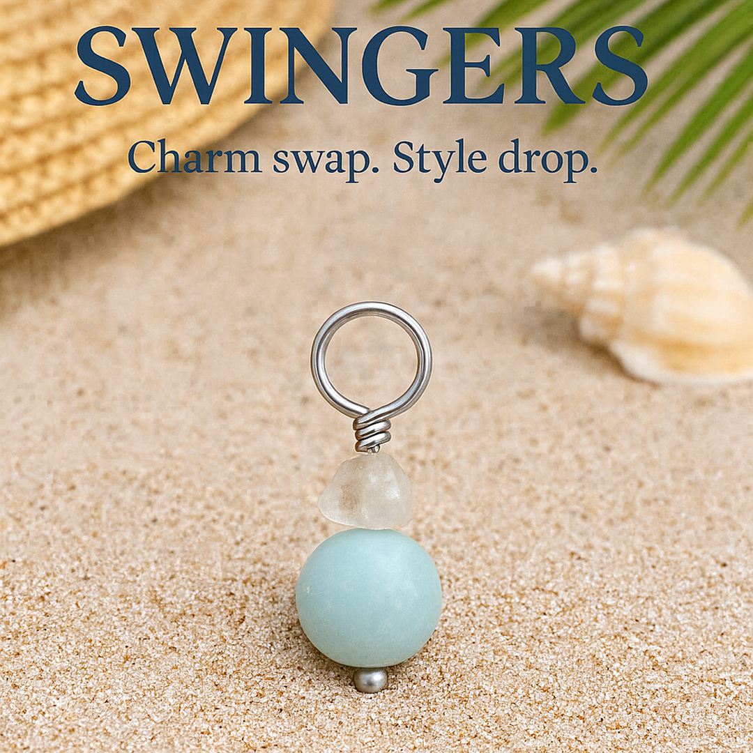 From the exclusive collaboration between Saltwater Silver and TummyToys® comes this exquisite detachable swinger, showcasing a stunning natural Blue Chalcedony coin as its focal point. The smooth, ocean-inspired gemstone is crowned with a crystal-clear quartz accent, adding brilliance and dimension to the design.