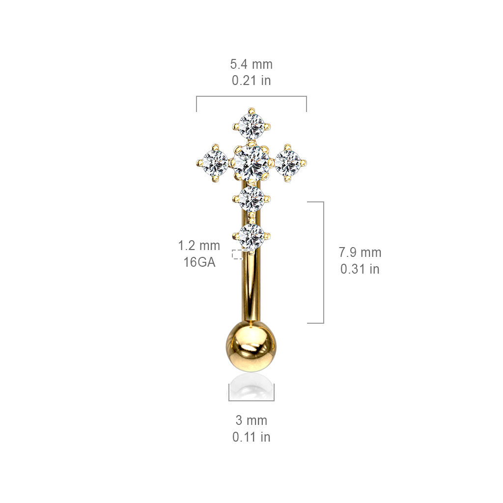 Elevate your style with this petite reverse belly ring, designed for both durability and sparkle. The barbell is crafted from 316L surgical steel, ensuring safety and long-lasting wear, while the cross charm is plated in rhodium, 14Kt yellow gold, or 14Kt rose gold over brass for a radiant finish. A CZ paved cross top adds dazzling brilliance to the sleek, curved design.