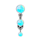A luminous reverse top‑down belly button ring crafted from 316L surgical steel, featuring a cascading trio of glowing moonstone‑effect gems in a chandelier‑inspired design. The top‑down setting highlights the stones beautifully, creating an elegant, radiant look that catches the light from every angle. Designed in 14G (1.6 mm) with a 10 mm (3/8") length for secure, comfortable wear. Sold individually.