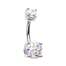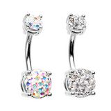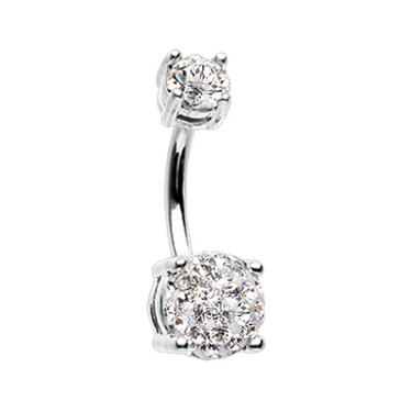 Introducing our timeless, micro paved belly bars in a classic prong setting. These sophisticated, understated belly button rings are comprised of aurora borealis cubic zirconia gemstones, meticulously grouped together for maximum light reflection. Fastened in a claw setting, the matching balls are attached to a 316L surgical steel belly bar shaft. Affordable glamour! Now available in crystal and aurora borealis.