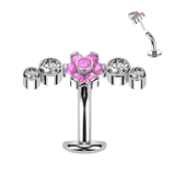 This classic floating belly ring boasts a flower centre jewel paved with synthetic opal, tightly fastened in a claw setting and complimented with cubic zirconia gemstones.