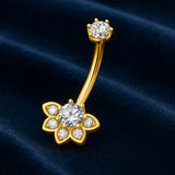 Crafted in luminous 14K yellow gold, the Lotus Aureum belly bar is a gilded ode to transformation. Its lotus motif, each petal tipped with a diamond, blooms from a curved barbell like a sacred rebellion. A larger diamond anchors the centre, radiating clarity and strength, while a single prong-set gem crowns the top of the navel ring with quiet authority.