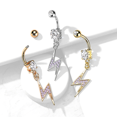 This striking belly button ring boasts an exceptionally gorgeous pendant of a thunder bolt, comprised of 14K rose gold plating with cubic zirconia gemstones. A sensational show stopper belly ring that makes a bold impact. Fully crafted with certified piercing materials including 316L surgical steel and 14K rose gold plating.