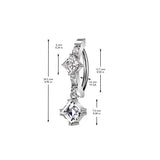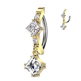 Elegance meets modern allure in this sparkling piece of belly ring jewellery designed to turn heads. The Lumière Drop belly bar features a hoop-style mechanism and a graceful cascade of clear gemstones. At the top, a square-cut gem is delicately tipped with a tiny round gem on each side, adding symmetry and subtle sparkle, while the bottom square gem sways freely below, the focal gems finished in 14k gold plating for a luxe, luminous touch.