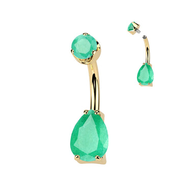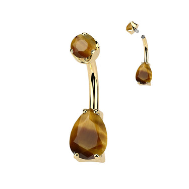This belly ring, crafted from 100% implant-grade titanium with PVD gold plating, features a delicate teardrop prong set with numerous natural gemstone colour options. It boasts a secure, internally threaded semi-bezel-set top ball with a lightweight finish for maximum piercing hygiene and comfort.