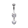 This dangly belly ring features a single crystal heart dangling freely from a prong set gem.