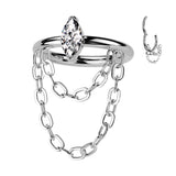 A refined hinged hoop crafted from implant‑grade titanium and accented with an outward‑facing marquise Cubic Zirconia and a delicate double‑chain dangle. Lightweight, hypoallergenic, and designed for smooth, secure wear. Meets professional piercing standards and adds movement and sparkle to your look. Sold individually.