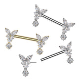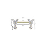 Crafted from high‑quality 316L surgical steel and brass, this nipple barbell combines durability with striking design. The threadless push‑in mechanism ensures smooth insertion and a secure fit, while the butterfly detail set with cubic zirconia adds a touch of charm. Finished with a diamond‑shaped CZ dangle, it’s a piece that balances sparkle, movement, and sophistication.