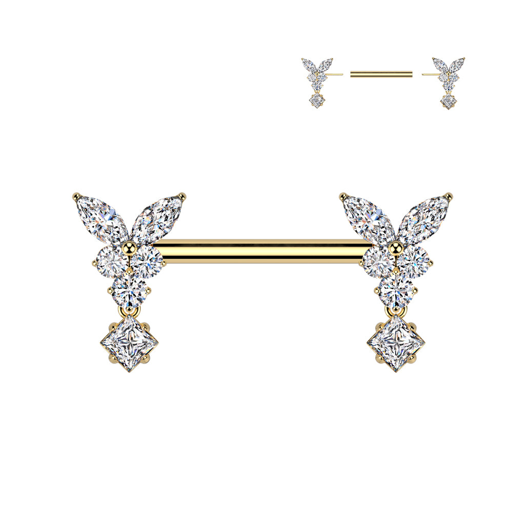 Gold Plated Surgical Steel Threadless Butterfly Nipple Barbell With CZ Dangle
