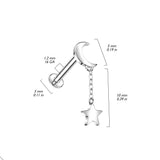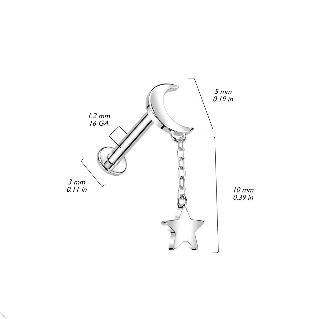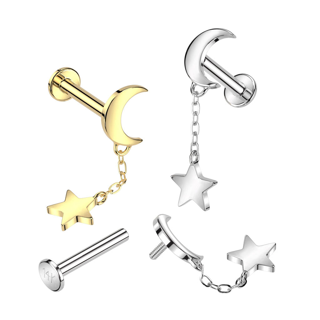Internally Threaded 14K White Gold Crescent Moon Top and Star Dangle Labret