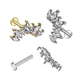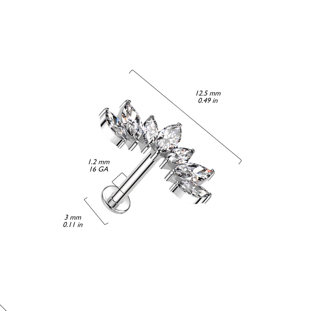This 14K Gold Internally Threaded Labret with 7 Marquise CZ Fan Top is crafted from solid 14K gold, ensuring premium quality, safety, and lasting brilliance. The elegant fan design, featuring seven marquise‑cut CZ stones, creates a striking sparkle and refined detail, while the internally threaded structure ensures smooth, secure, and comfortable wear.