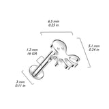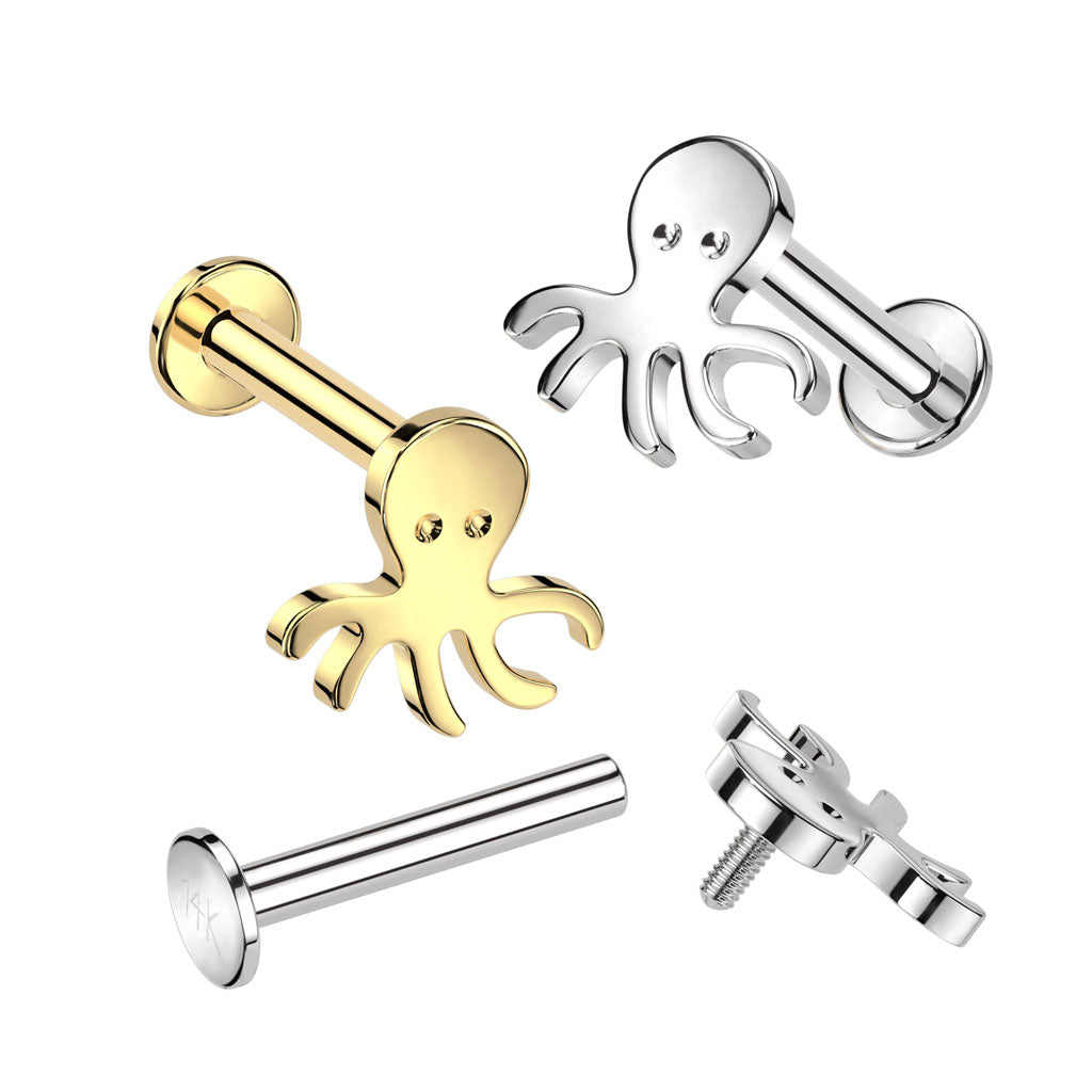 This 14K Gold Internally Threaded Labret with Octopus Top features a 3mm base size for secure, comfortable wear. Crafted from solid 14K gold, it ensures premium quality and lasting brilliance. Designed for professional body piercing applications, it offers durability, safety, and ease of use.