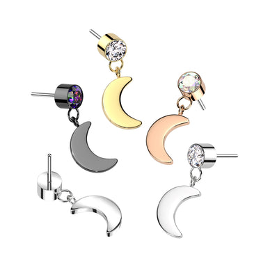 Rose Gold Plated Titanium Threadless Push In Round Bezel Set CZ With Crescent Moon Dangle