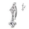 Elegance meets modern allure in this sparkling piece of belly ring jewellery designed to turn heads. The Lumière Drop belly bar features a hoop-style mechanism and a graceful cascade of clear gemstones. At the top, a square-cut gem is delicately tipped with a tiny round gem on each side, adding symmetry and subtle sparkle, while the bottom square gem sways freely below.