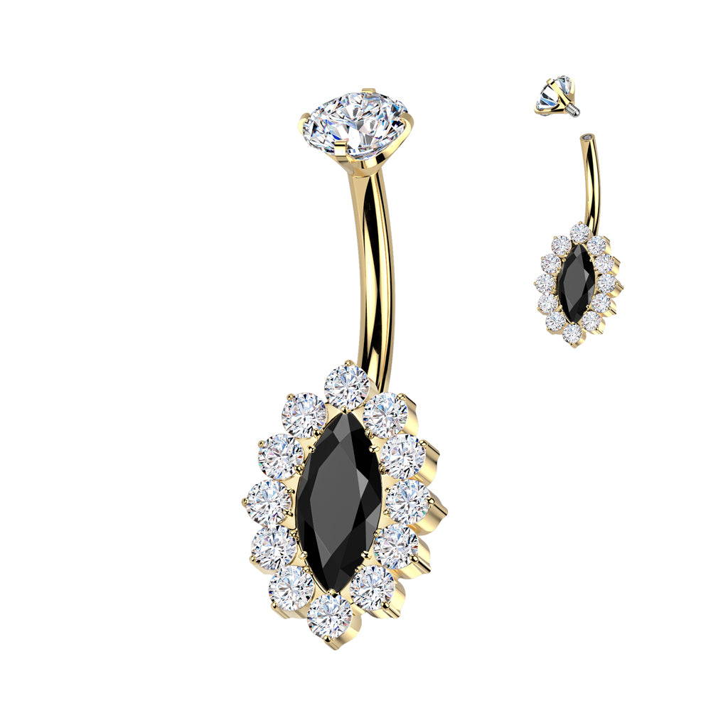Turn heads after dark with the Midnight Mirage, a luxurious gold titanium belly ring designed to captivate. This premium belly piercing features a marquise-cut black gemstone framed by a micro pave of clear crystals, creating a shimmering illusion that dances with every movement. The high-polish gold belly bar is internally threaded for a smooth, secure fit, making it ideal for everyday wear or special occasions.