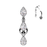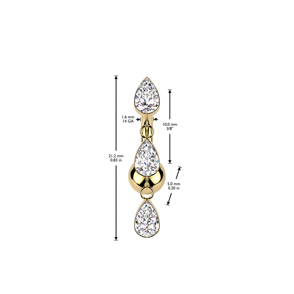 Gracefully engineered, this threadless belly button ring features three bezel-set teardrop CZ dangles for elegant movement and sparkle. Crafted from implant-grade titanium, it offers superior safety, comfort, and corrosion resistance—ideal for professional piercing standards. The push-in design ensures secure wear with effortless insertion.