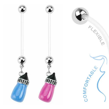 A delicous maternity belly ring for the expecting mother, this cleverly designed belly bar boasts a bottle pendant in your choice of either rich blue or hot pink, fastened to a clear Bio flex bar.