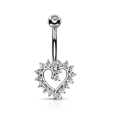 This classic solid 14k white gold belly button ring features a fixed heart with sparkling cubic zirconia gems.