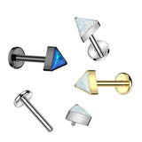 Crafted from ASTM F‑136 implant‑grade titanium (6AL‑4V‑ELI) with yellow gold PVD plating, this internally threaded labret stud is engineered for maximum safety and biocompatibility. Tested for professional body piercing applications, it ensures durability and ease of use. The design features a bezel‑set synthetic triangle opal top, offering radiant colour and secure comfort with a 4mm flat back base.