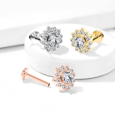 A stunning cubic zirconia paved flower earring in crystal creates a fabulous statement for your earring collection. Casual, summer themed jewellery to complete your curated ear. A perfect accent piece for your helix, conch or tragus with a touch of classic glam.