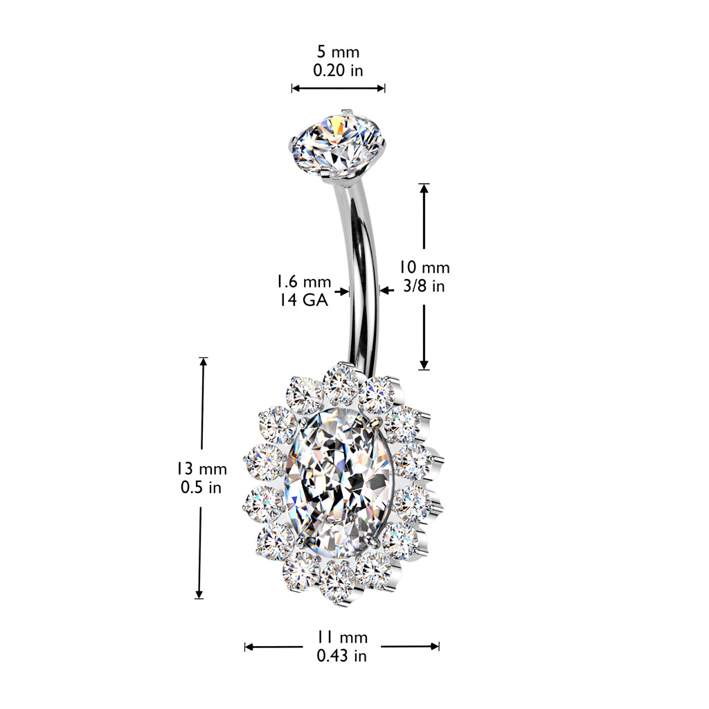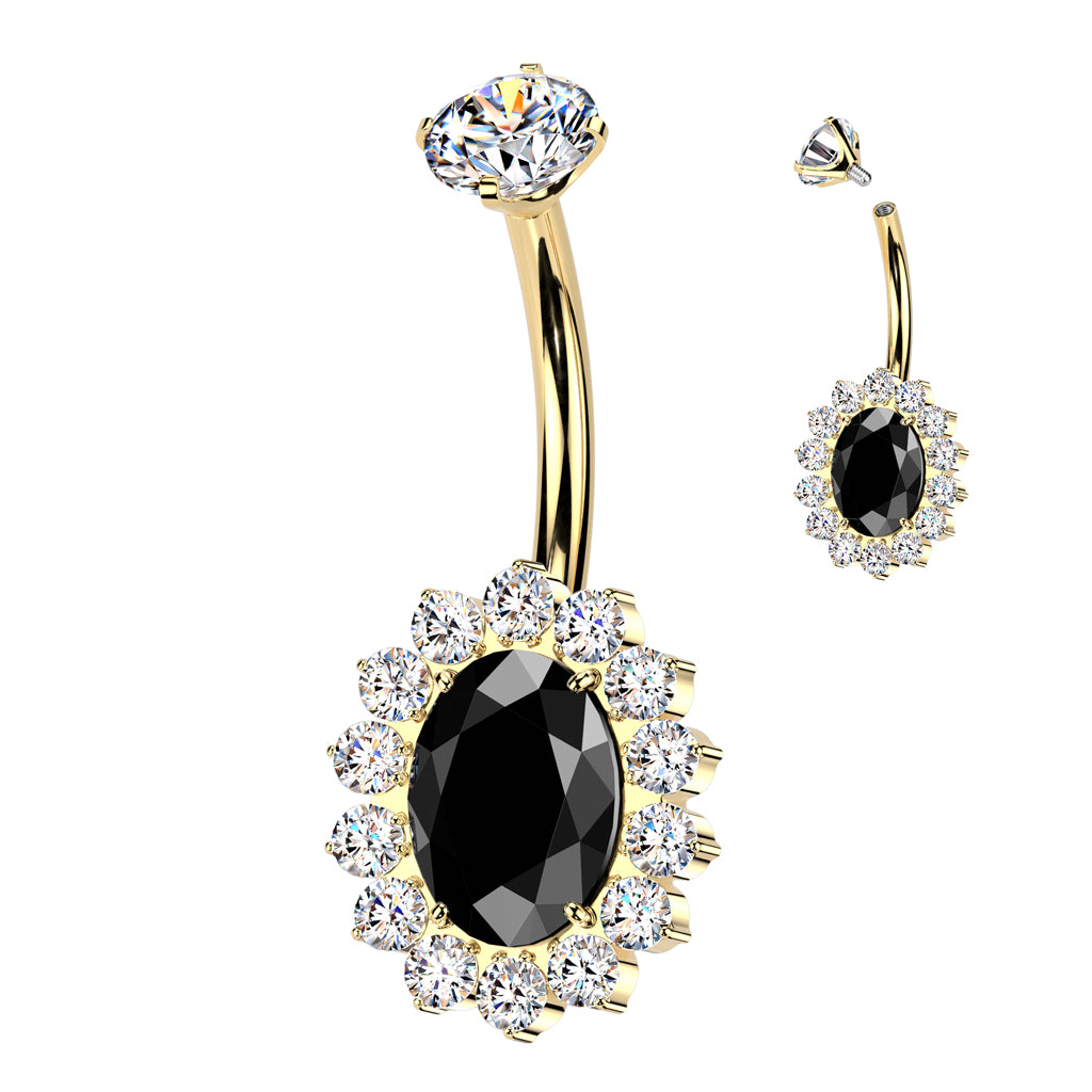 - Design: Oval belly button ring with Computer Numerical Control CZ pavé edge in crystal or black