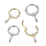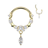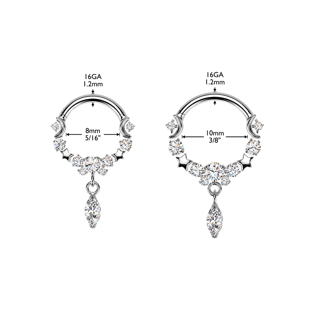 Crafted from ASTM F‑136 implant‑grade titanium (6AL‑4V‑ELI) with yellow gold PVD plating, this hinged segment hoop ring is designed for maximum safety and biocompatibility. Tested for professional body piercing applications, it ensures durability and ease of use. The celestial design features a moon-and-star motif with a marquise CZ dangle, available in a radiant PVD gold finish, offering both elegance and secure comfort.