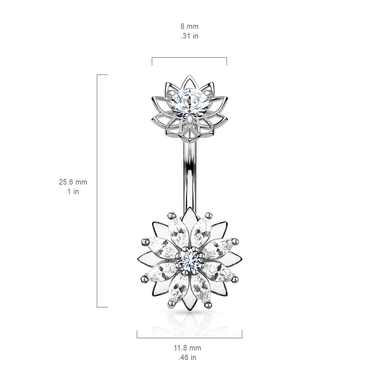 Our marquise bloom belly button ring, featuring an internally threaded top ball and floral attachment with cubic zirconia gems. A sophisticated piece for your collection that can be dressed up or down for a cute ensemble.