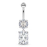 With plenty of length and a lot of pizazz our sparkling Très Chic belly button ring boasts two key areas of glitz, the first a fixed daisy flower gem and the second a large marquis cut dangly pendant.