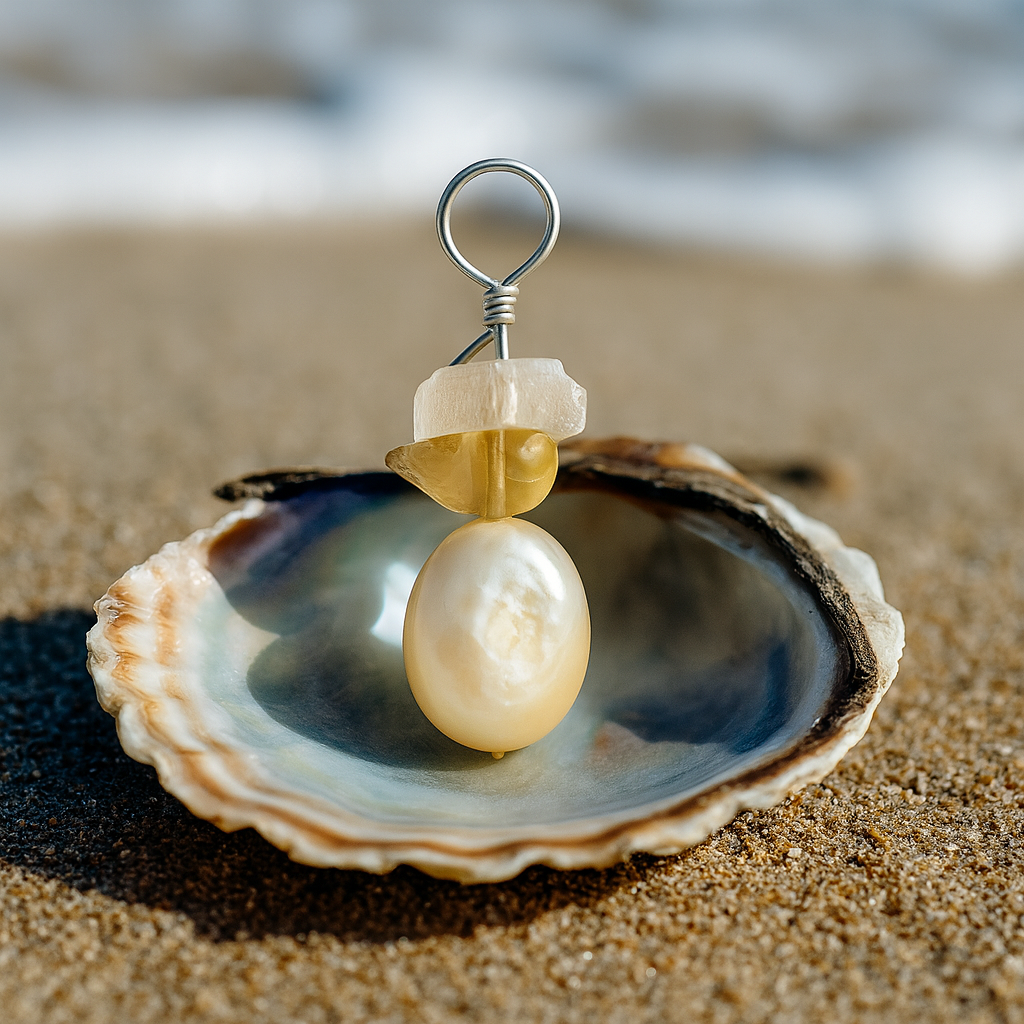 From the exclusive Saltwater Silver collection comes this elegant detachable swinger, featuring a harmonious trio of natural gemstones — a milky quartz, a golden citrine quartz, and a radiant orange pearl.