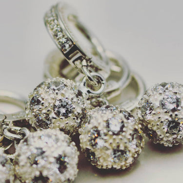This belly ring is comprised of 100% premium 925 silver including the charm part. The piece features a paving of cubic zirconia gemstones on both the clasp and the disco ball.