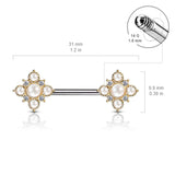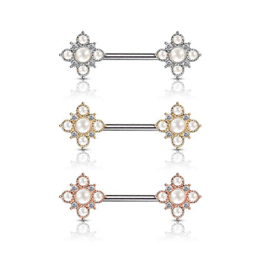 This nipple ring delivers an elegant, bold design featuring pearl and cubic zirconia gems in the shape of a diamond. The nipple shaft measures 14mm and is made from 316L surgical steel and 14k yel. gold plated with pearl and cubic zirconia gemstones.