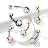 This is our iridescent stone belly rings, colourful and bright. The belly bars are comfortable to wear, bargain priced and suitable for year round wear. Waterproof and durable, our iridescent stone belly rings offer a unique twist on the standard classique belly bars.
