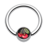 Check out these cherry delicious captive bead belly button rings. The logo print beaded ball is a generous 6mm glass coated fitting displaying a vivid fruity print against a jet black background. Comprised of 316L surgical steel, these captive belly rings are a standard 10mm, 14g sizing.