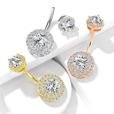Our crowned Jojo belly bars feature a traditional halo pendant consisting of a large focal gemstone, micro paved with matching mini gems. The piece is elaborately crowned with a matching halo top ball for a spectacular, eye catching finish.