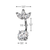 Our crowned Señora belly bars deliver a high elegance with a unique petal top. Featuring a generously sized prong set base which is elaborately crowned with a trio petal setting that creates an eye catching finish. The piece is further enhanced with a 14K yellow gold plated finish.