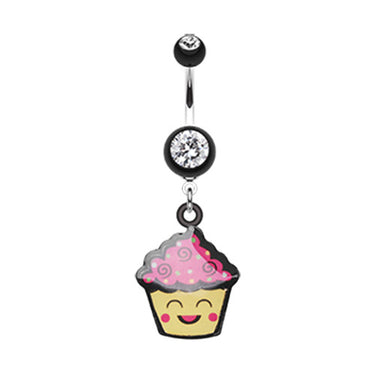 This loveable and adorable must have belly bar is packed full of cuteness with a smiley face, blushed red cheeks and hot pink icing to top. The full piece is set on a shiny black acrylic base and finished with cubic zirconia gemstones on the belly bar balls.