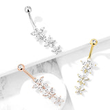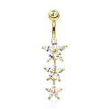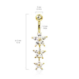 Where glamour meets garden party. This statement belly bar reimagines the classic flower pendant into a shimmering trail of three blooming daisies—lightweight, fluid, and full of movement for the ultimate body jewellery flourish.