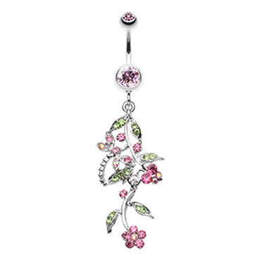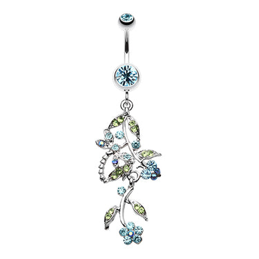 This dangly surgical steel belly ring boasts an elaborate drop of soft gems that combine to form a garden vine topped with a dragonfly. Available in three stunning colours.