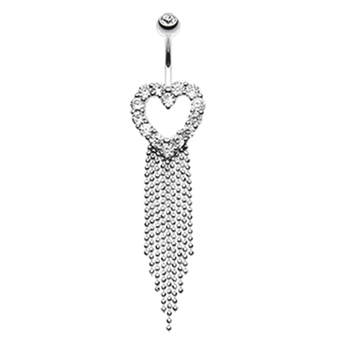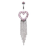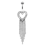 This impeccable dangly navel piercing bar boasts a delicate micro paved heart that falls into a chandelier of beaded chains. Available in your choice of three stunning colours.