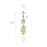 This belly ring is comprised of premium 316L surgical steel with 14K yellow gold plating and cubic zirconia gemstones.