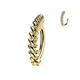 Add a unique twist to your look with this 14kt gold plated 316L Surgical Steel Twisted Bar Hinged Belly Button Clicker Ring. This piece's sleek, twisted bar design effortlessly combines elegance and style. The secure hinged mechanism ensures easy wear, making it a practical yet striking addition to your jewellery collection. Sold individually.