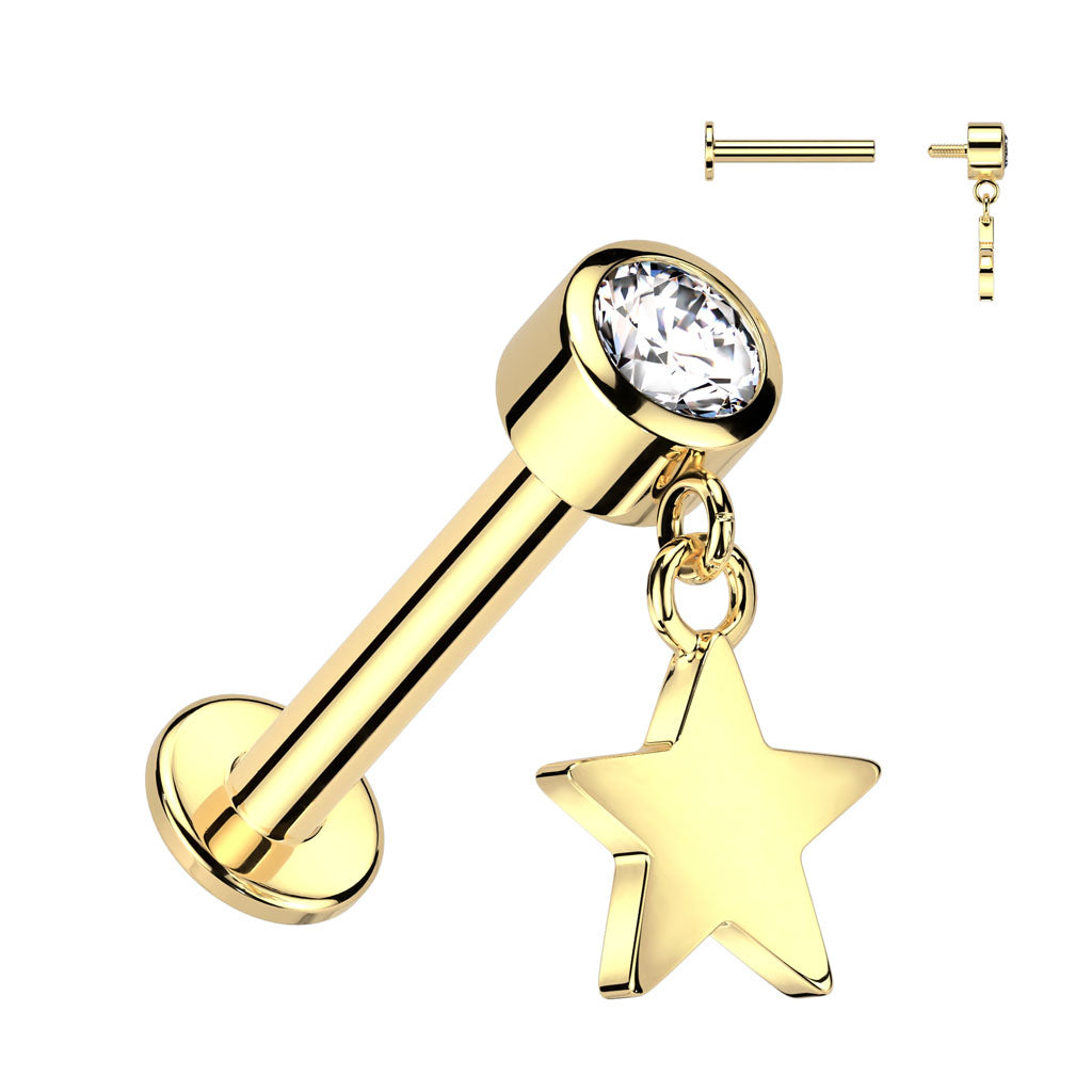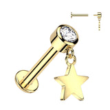 Internally Threaded 14K Yellow Gold Bezel Set CZ Top and Star Dangle Labret