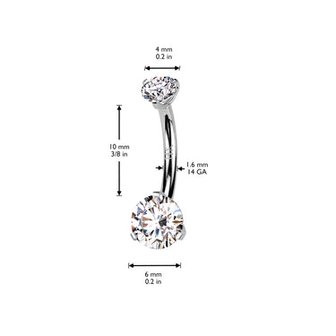 A premium, 100% solid 14K white gold belly ring boasting internal threading for maximum hygiene. The base of the belly bar features a dainty 6mm prong set rounded jewel, matched with a rounded prong set top ball. Supplied in the standard 10mm bar length, however you can optionally customise your bar by altering the length for a snug fit for both short or long piercings.