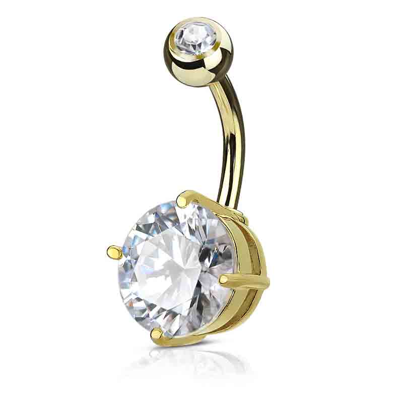 - The base of the belly bar features a ball sized 10mm, 14k yel. gold plated with a prong set gem.