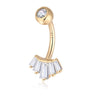 Crafted in 100% certified 14k yellow gold and internally threaded for a smoother, more hygienic fit, this is the style piercers reach for and collectors covet. Hallmarked for authenticity, it features a bold 5mm top ball and a radiant fan of five baguette-cut crystals. Light catching, jaw-dropping, and unapologetically beautiful.