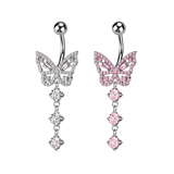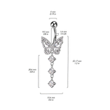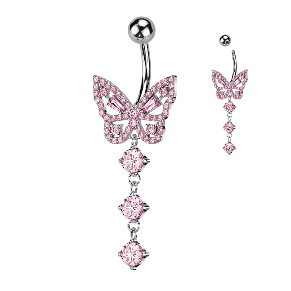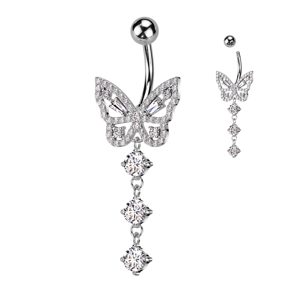 - The base of the belly bar features a fixed butterfly with the dangles falling beneath.