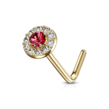 This is our premium 14K yellow gold, L bend, nose ring, suited for nostril piercings. The body jewellery features a classic round cluster that is accentuated with tiny cubic zirconia beading.