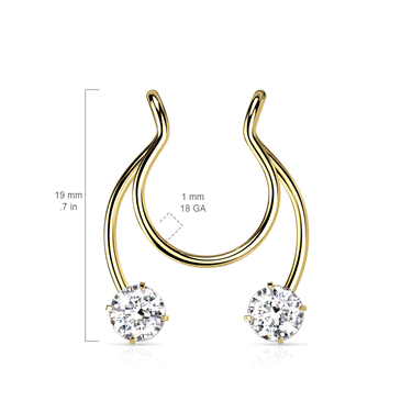 Like the piercing without the dedication to a new piece of permanent bling? Our clip-on septum range is perfect for this. A removeable piece of jewellery that features two cubic zirconia front facing gems on a prong set fitting.